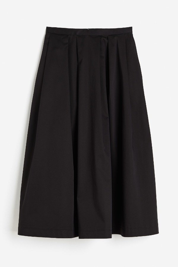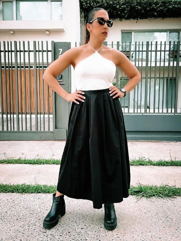 Falda: Modelo evasé en tejido de algodón con pliegues de caja en la parte superior para definir la figura. Modelo midi de tiro alto con cremallera oculta y botón detrás.