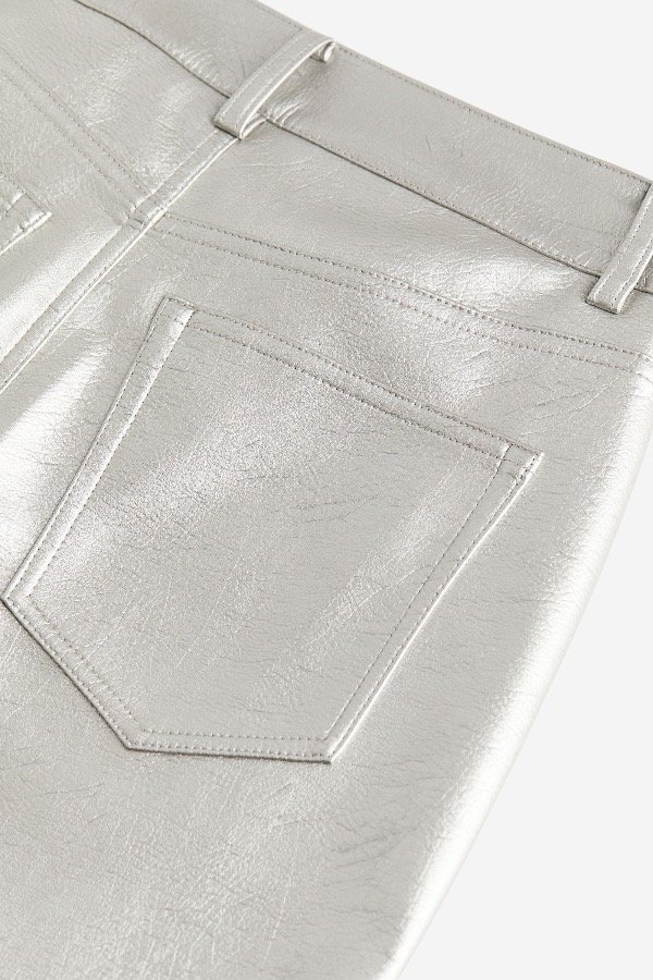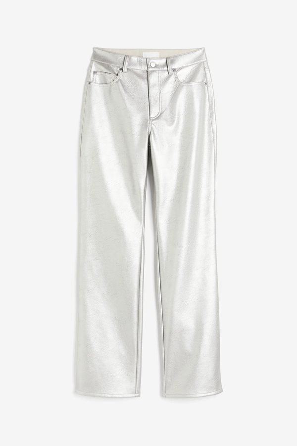 Modelo de calce ajustado con cintura de tiro alto, cierre con botón y piernas rectas.
