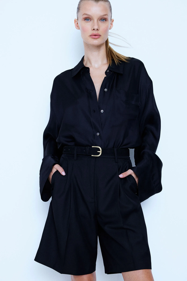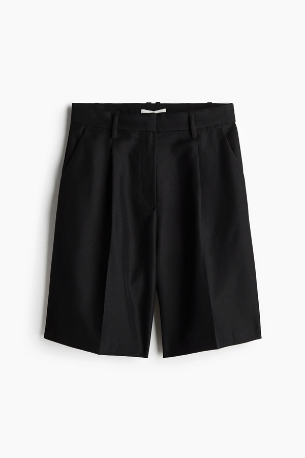 Bermudas de tiro alto con pinzas y cierre con broche y botón ocultos.