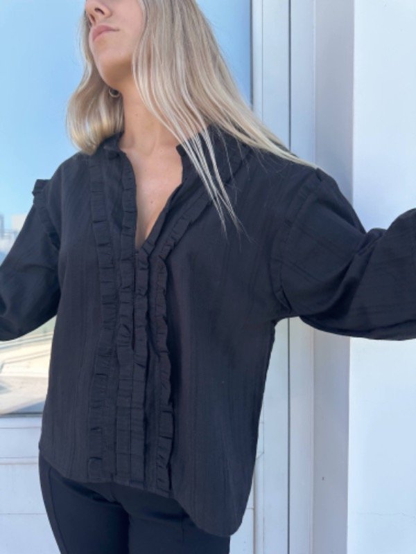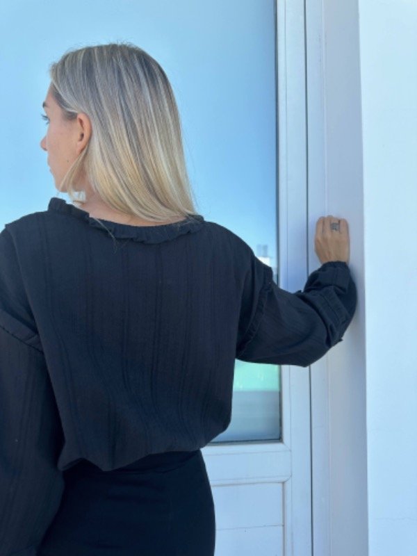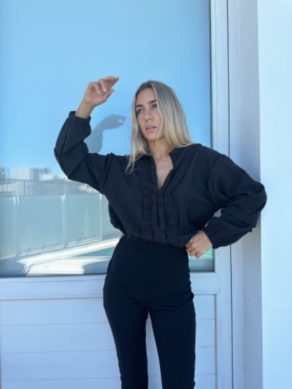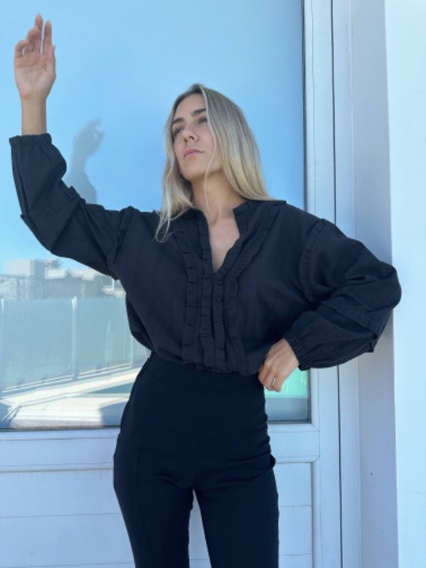 Blusa escote V con volados en el delantero, compuesta de algodon tramado, mangas con elastico en puño y botones internos para profunddad de escote.