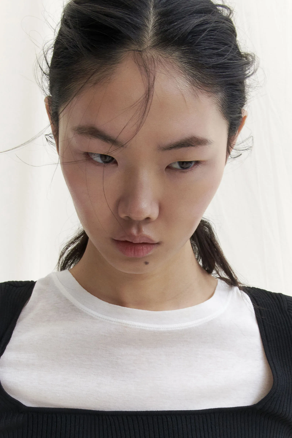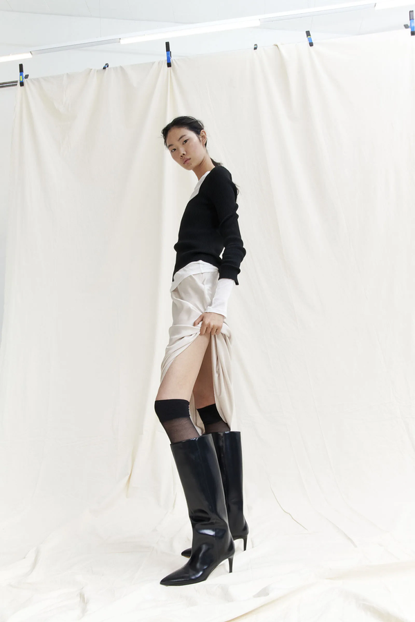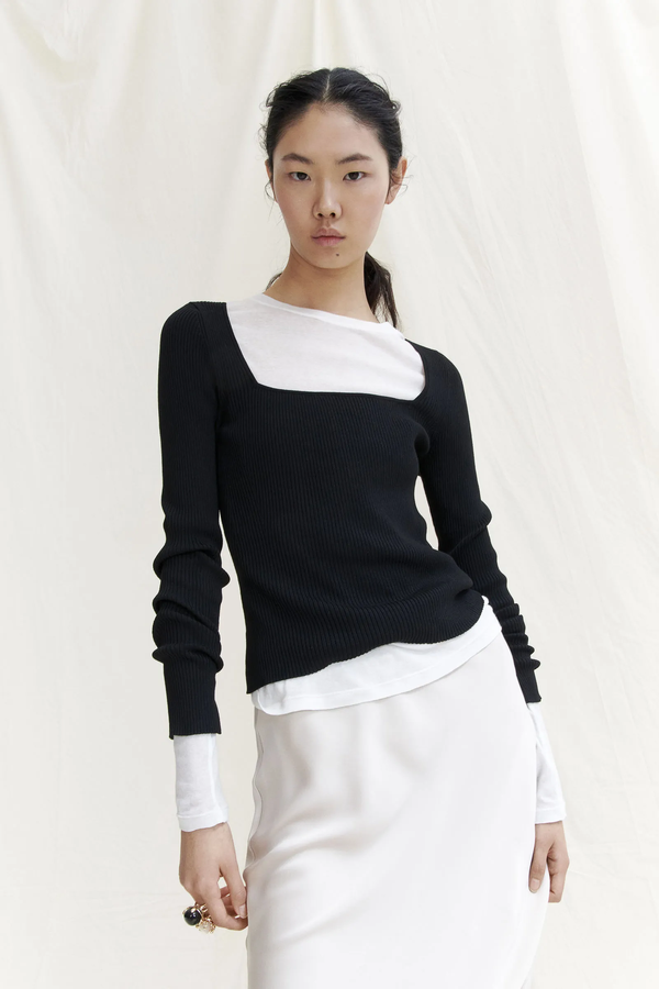 Blusa entallada en punto acanalado fino de mezcla de viscosa. Modelo con escote cuadrado, sección en punto menguado sobre el busto y mangas extralargas con abertura en los puños.