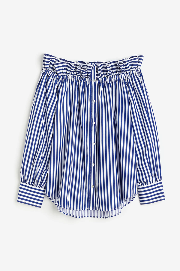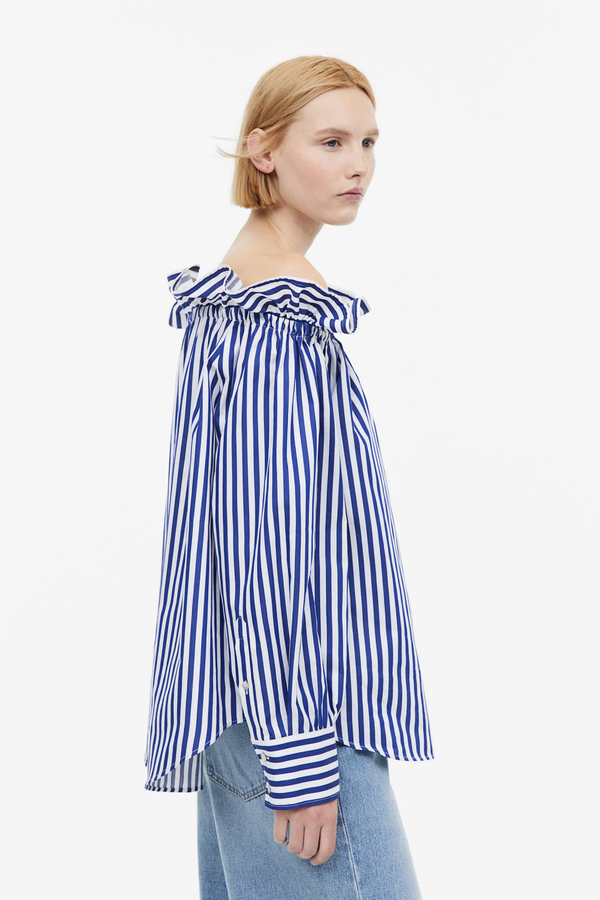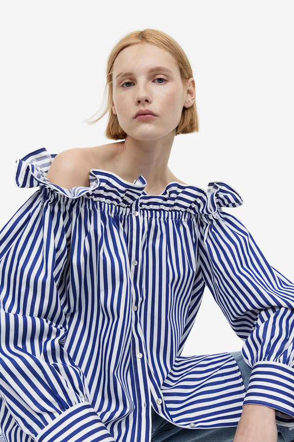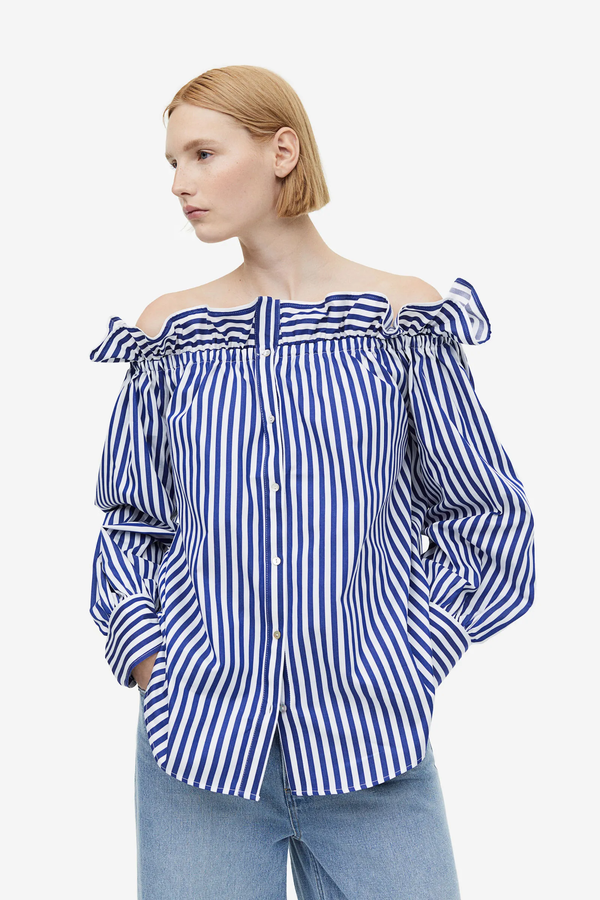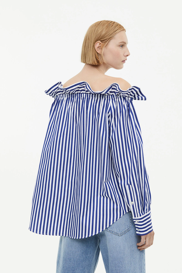 Blusa en tejido suave de algodón con hombros al descubierto y ribete elástico de vuelos en el escote.