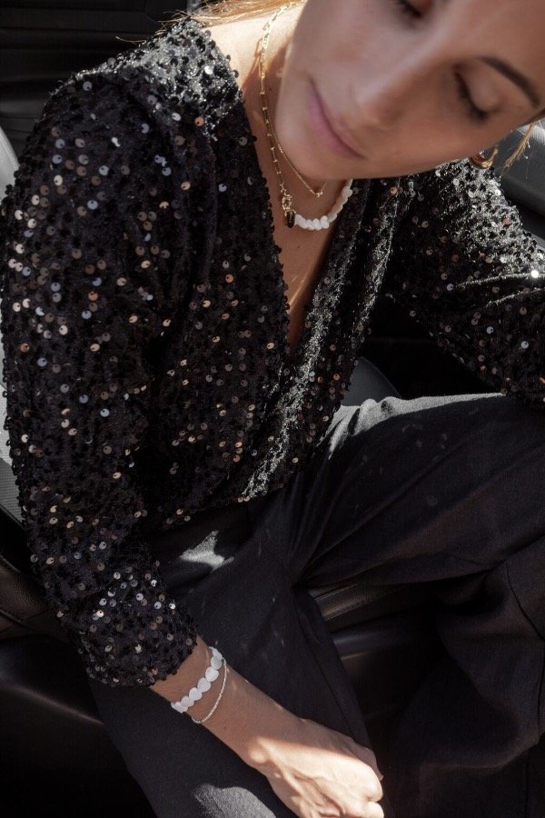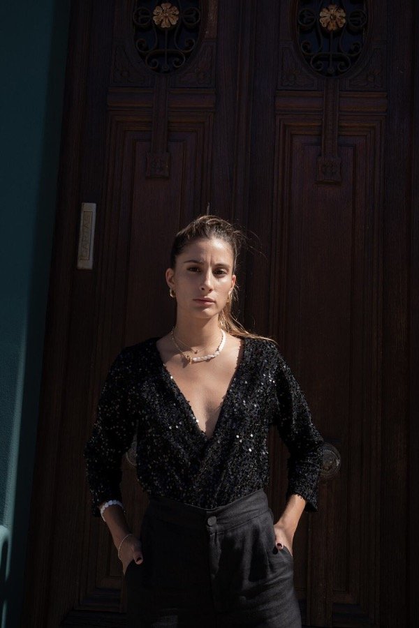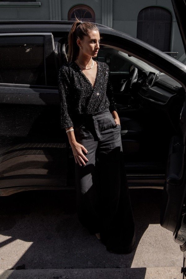 Body con torso de lentejuelas bordadas, forrado y con bombacha de creppe de punto (elastizado).