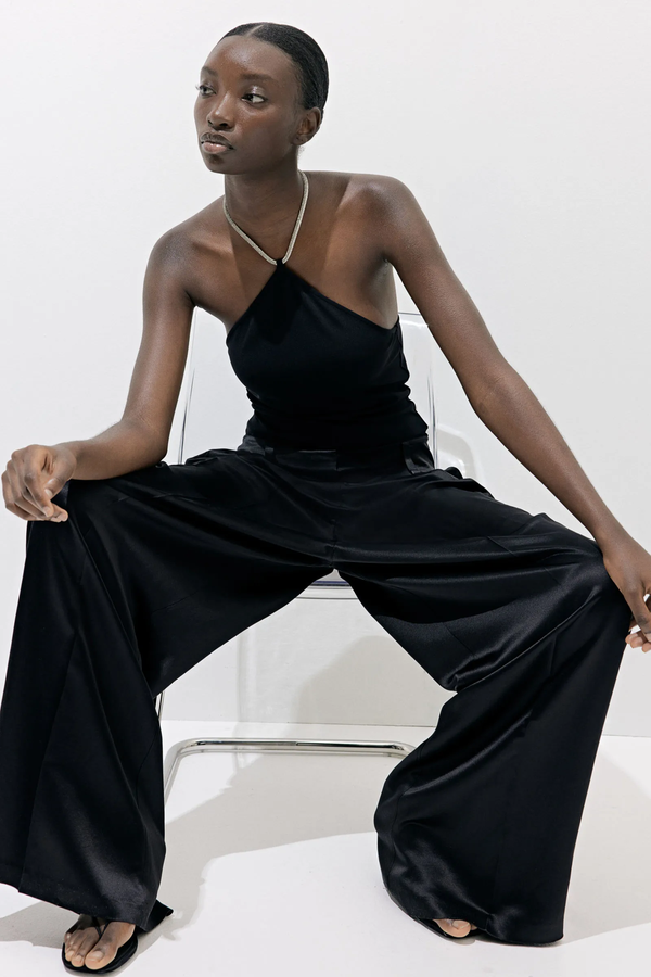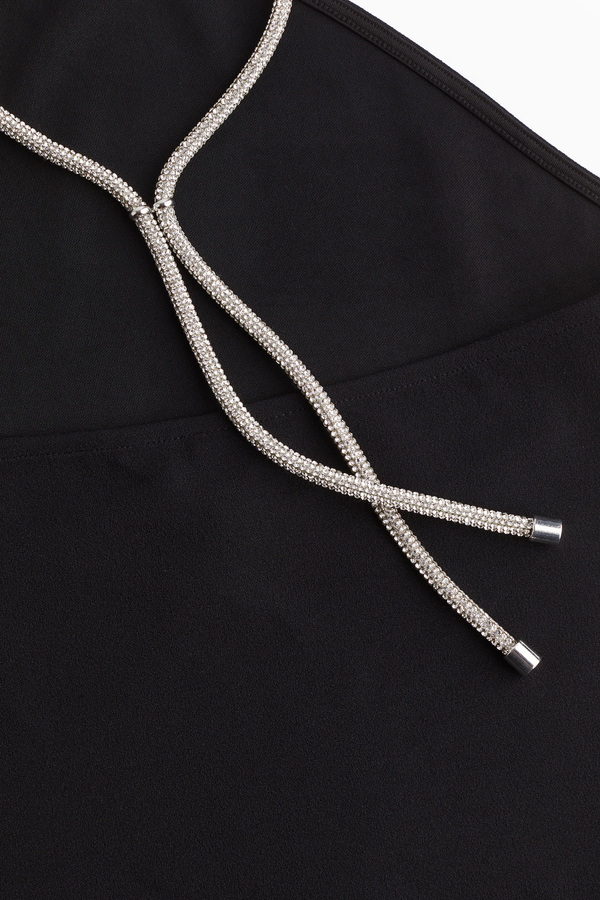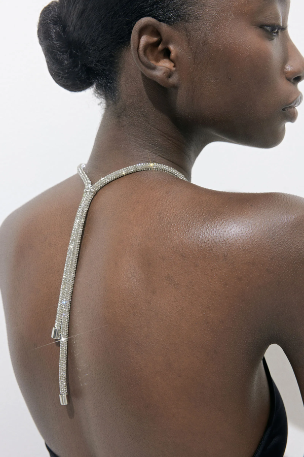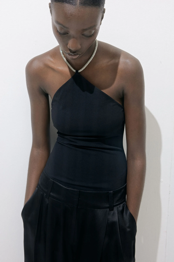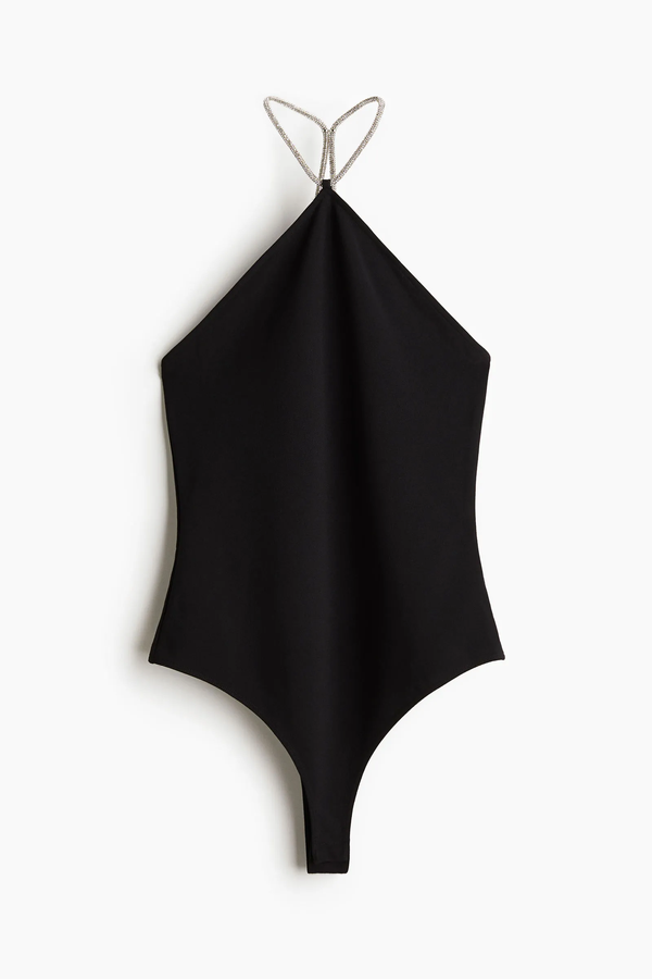 Modelo colaless en punto de crepé suave con escote alto y tira redonda de strass con cierre en la nuca, cuenta con botones a presión ocultos en la entrepierna.