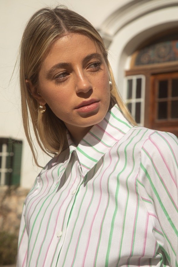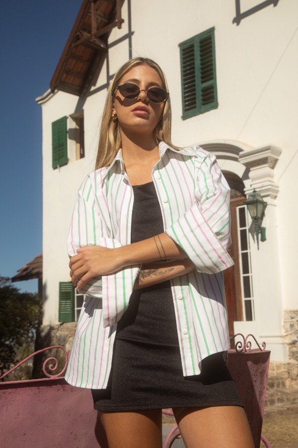 Camisa largos irregulares, compuesta en poplin grueso, con tajos laterales y detalle de rayas invertidas en puños y canesu de espalda.