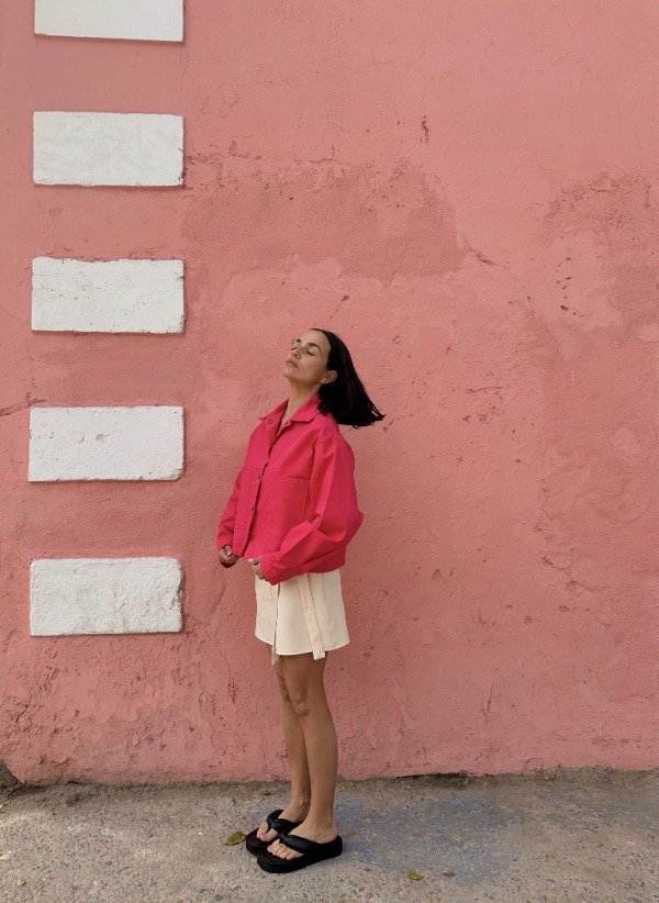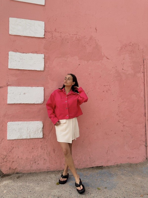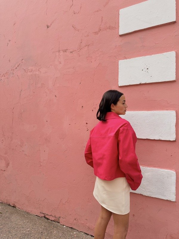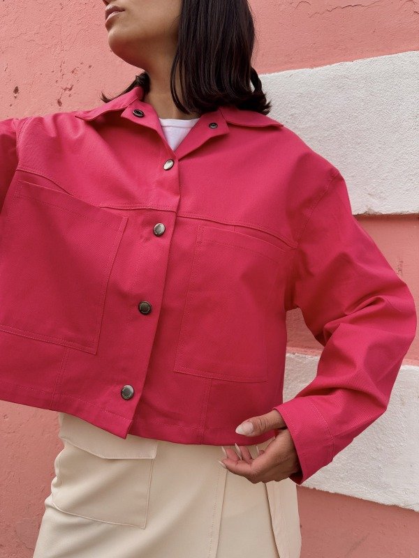 Campera oversize corta de gabardina, con recortes en delantero y espalda, bolsillos frontales y botones a presion .