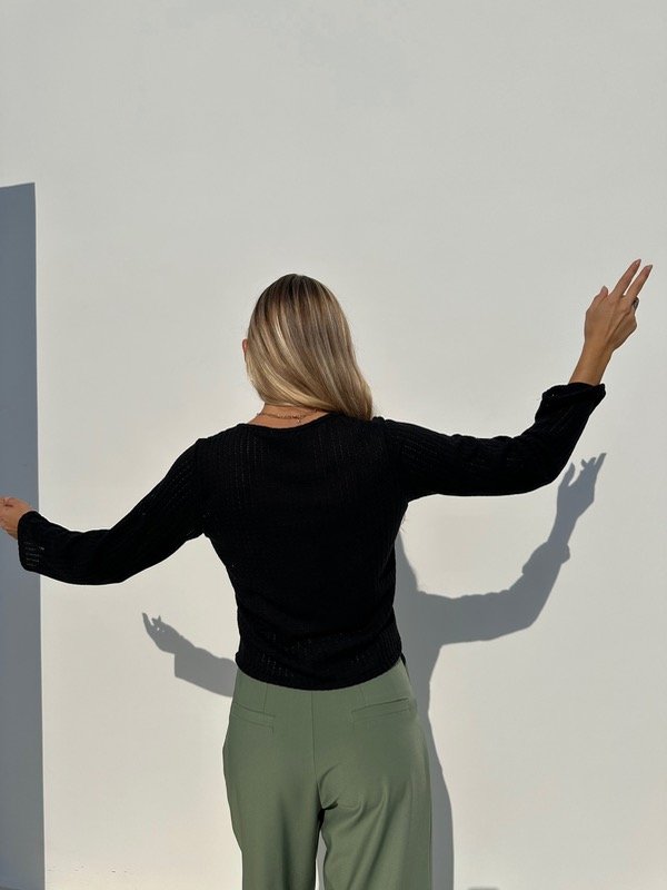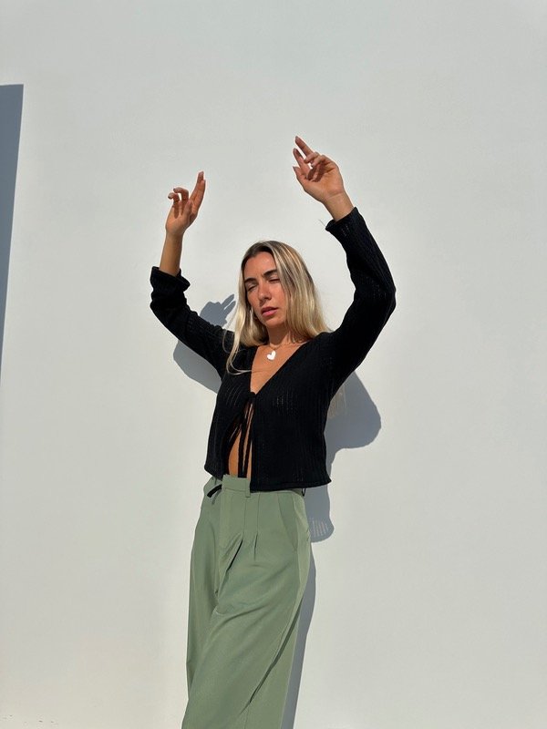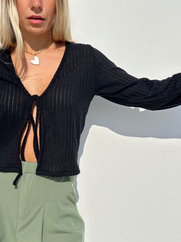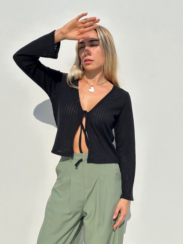 Top escote en V, compuesto en tejido de algodon y mangas largas con lazos en el delantero para atar y ajustar.