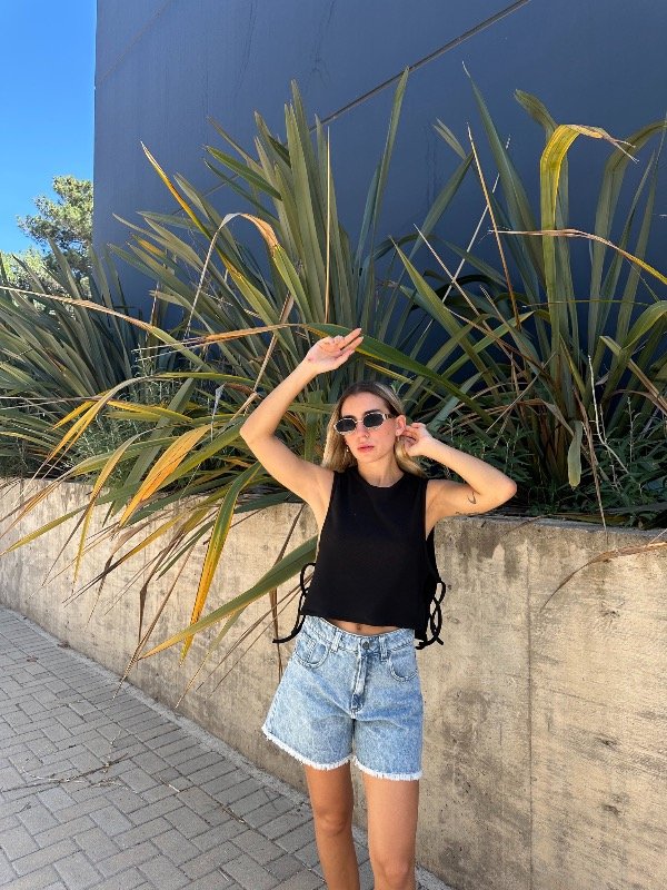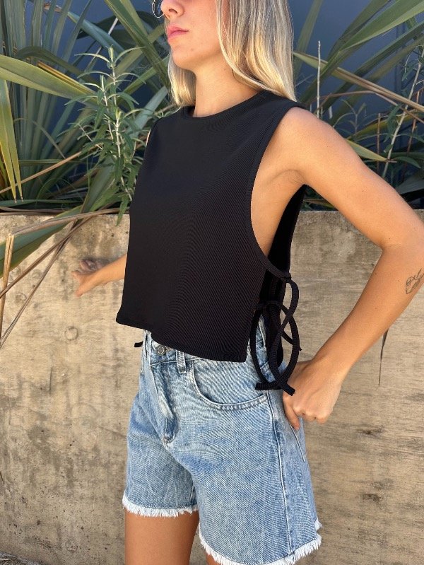 Top de morley grueso, abierto en los laterales con lazos para atar y ajustar .