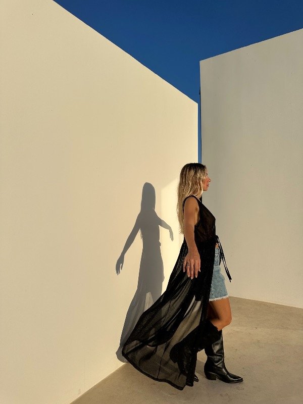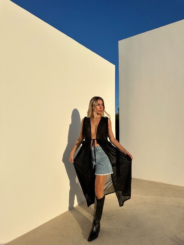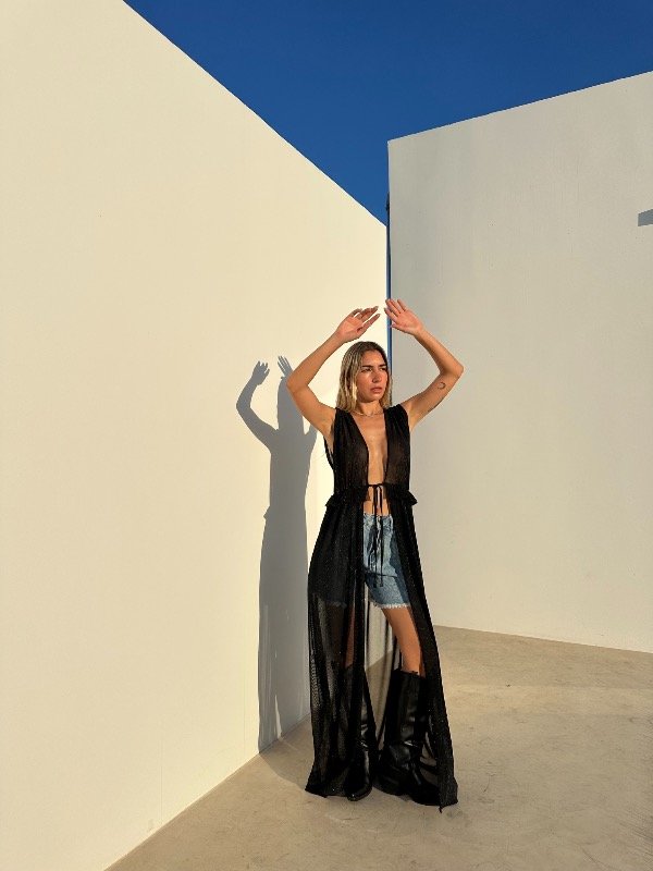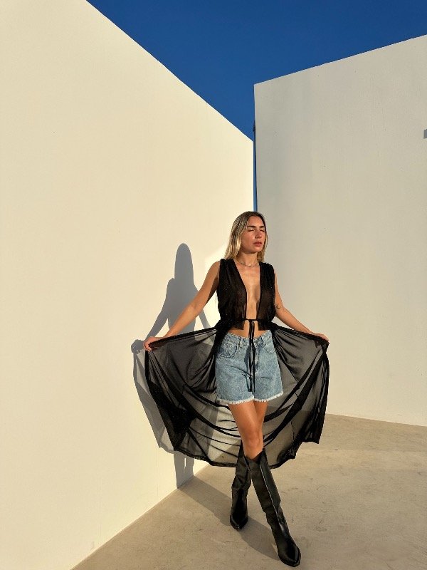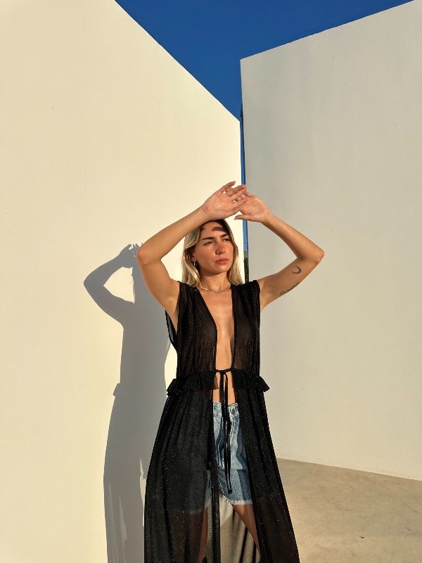 Kimono largo compuesto en tul elastizado con lurex, con lazo para atar, recorte en bajo busto con volados en el frente y frunces en la espalda .