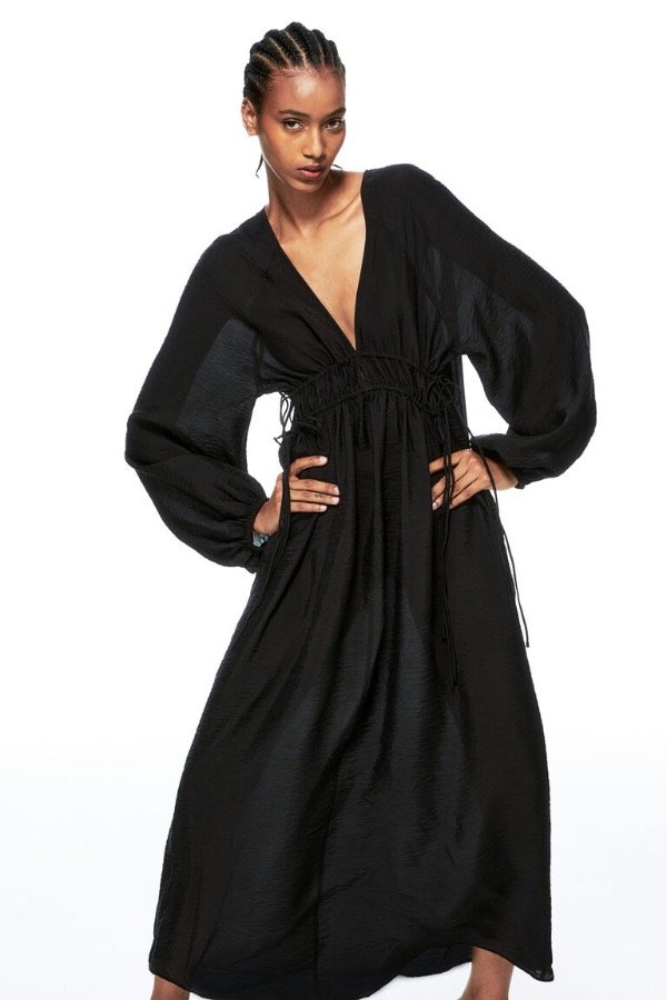 Vestido extragrande hasta la pantorrilla en tejido con un escote en V profundo y cordones estrechos debajo del busto que se atan a los lados.