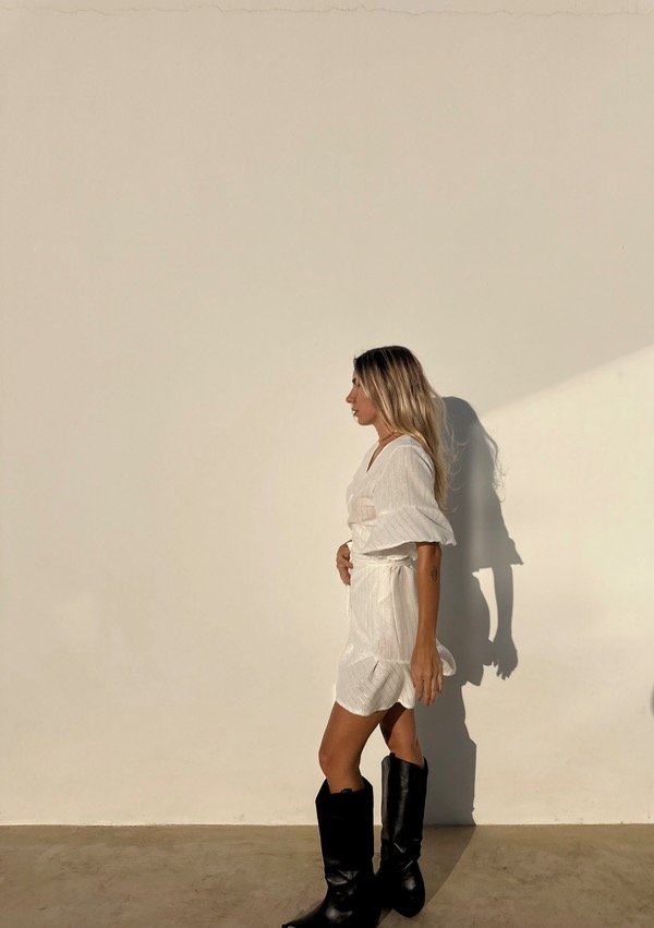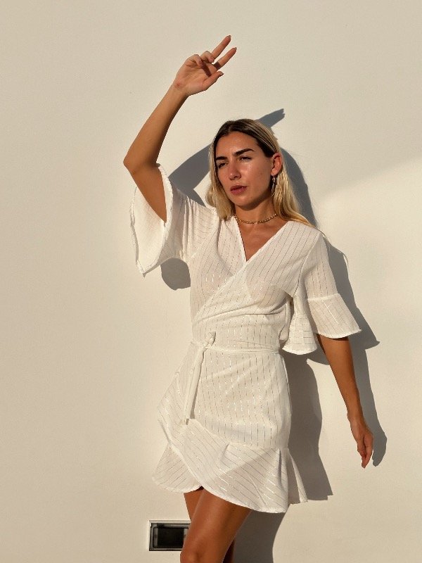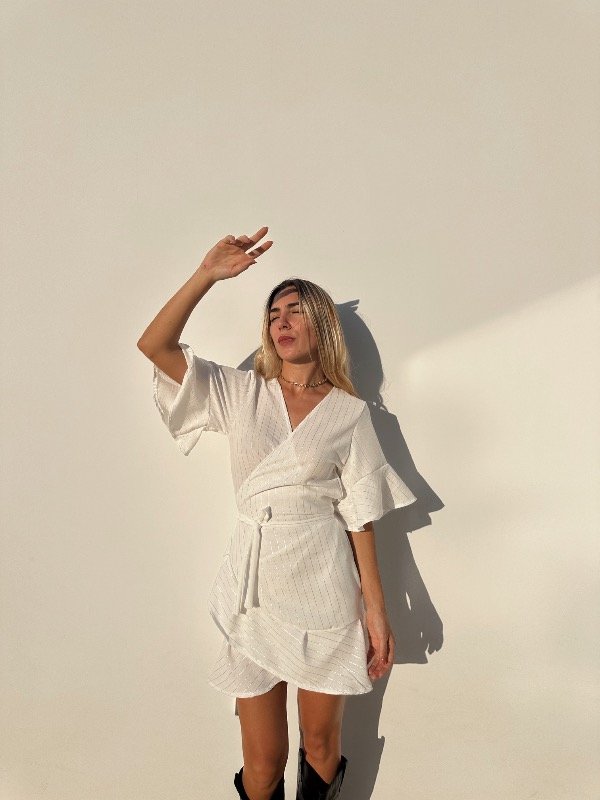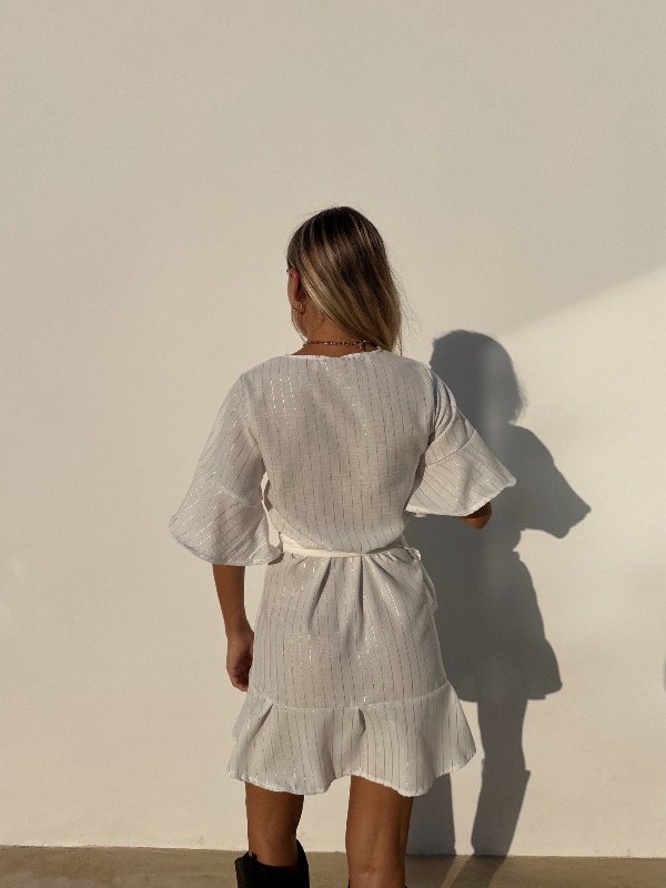 Vestido portafolio realizado en símil lino con lurex, con volados en ruedo y en mangas, con lazos para atar y ajustar.