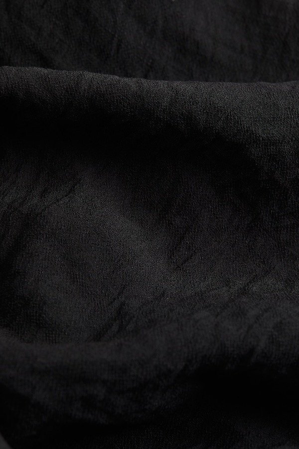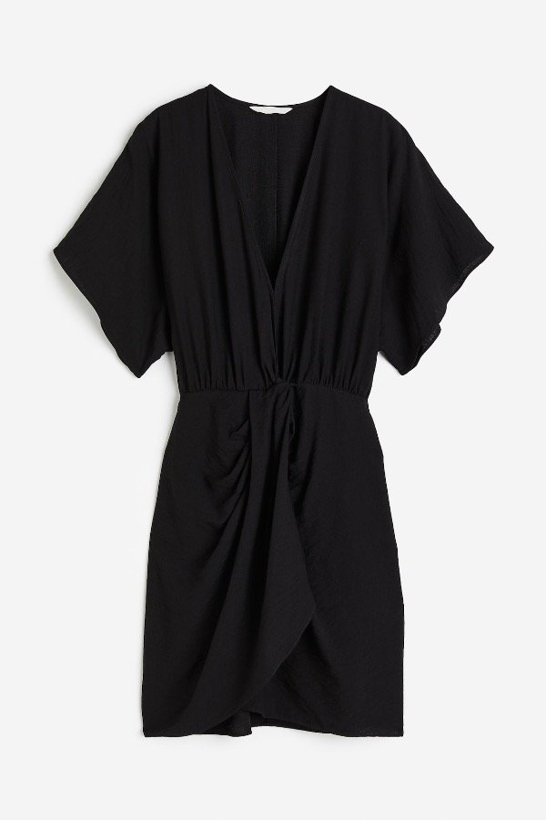 Mangas anchas al codo, costura elástica en la cintura y falda con diseño cruzado.