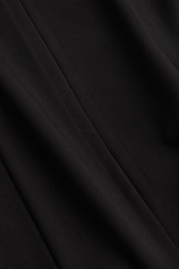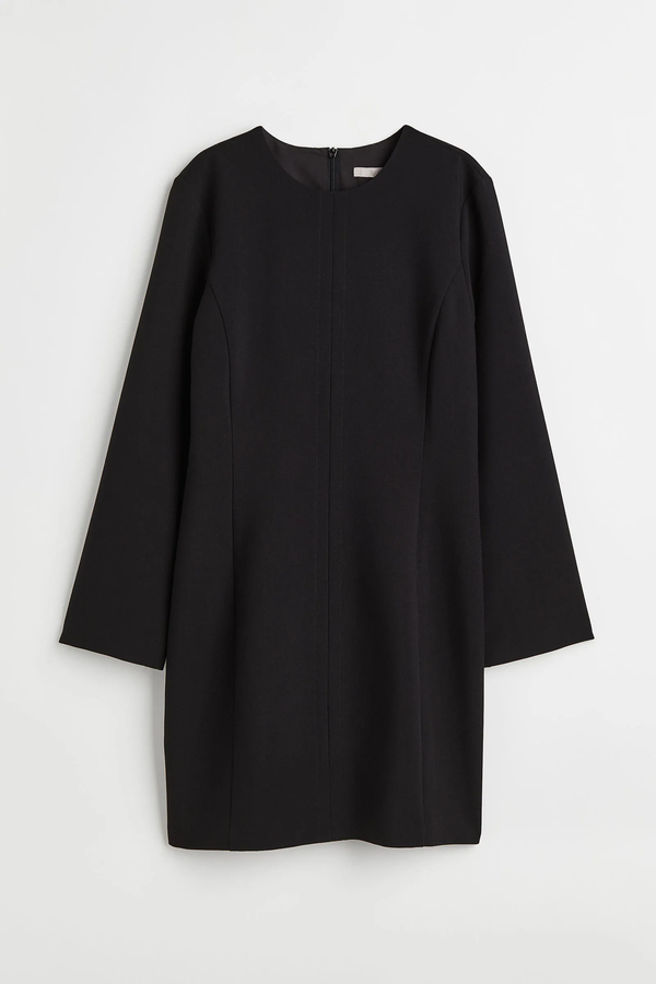 Modelo entallado de manga larga con cuello redondo, cierre oculto en la espalda y basta recta.