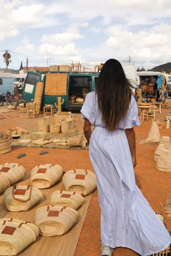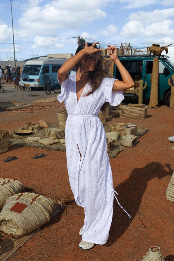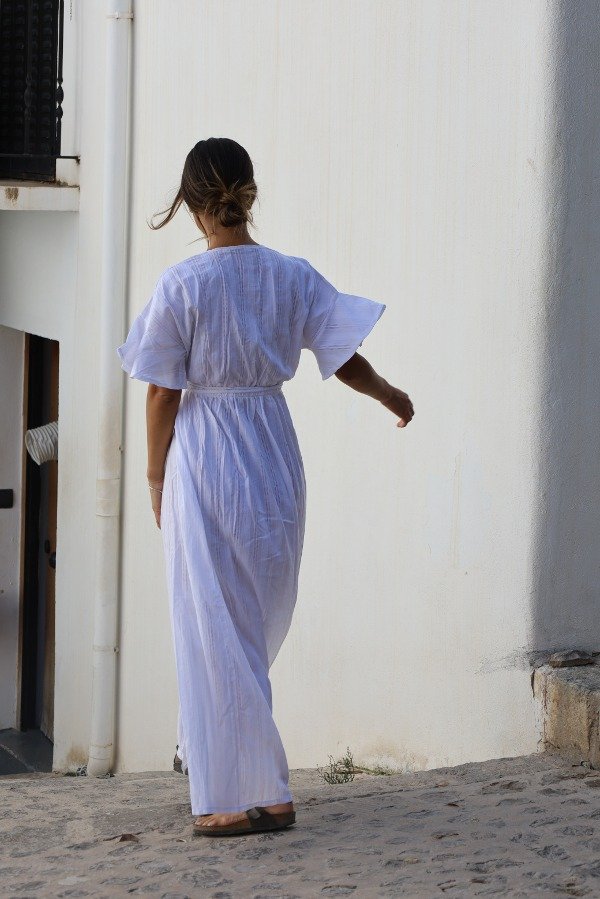 Vestido kimono largo con volado en mangas, elástico en cintura y lazo para atar.