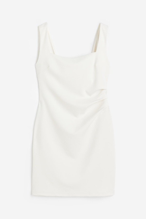 Vestido corto de punto, con cuerpo forrado, con breteles anchos y escote cuadrado adelante y atrás.