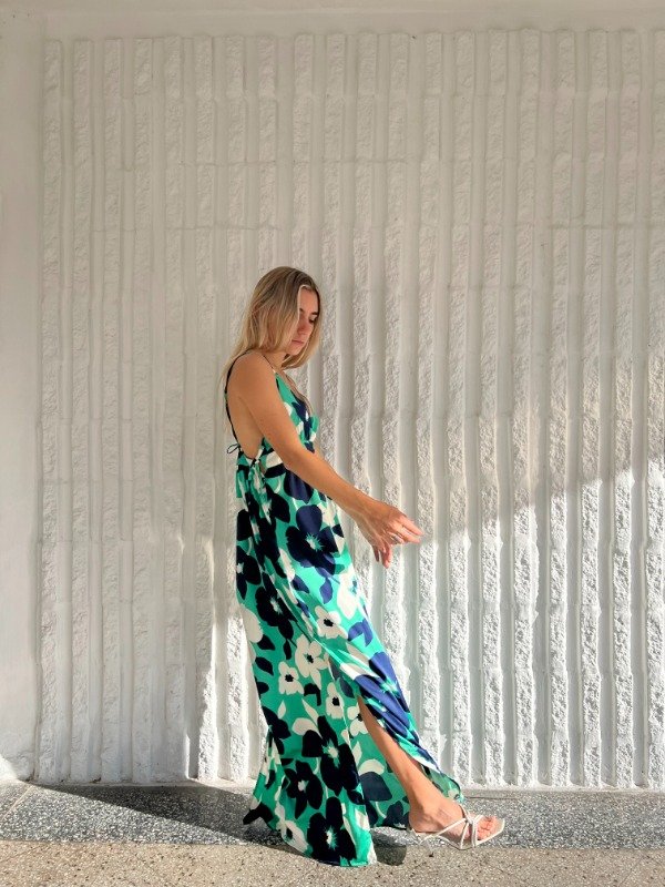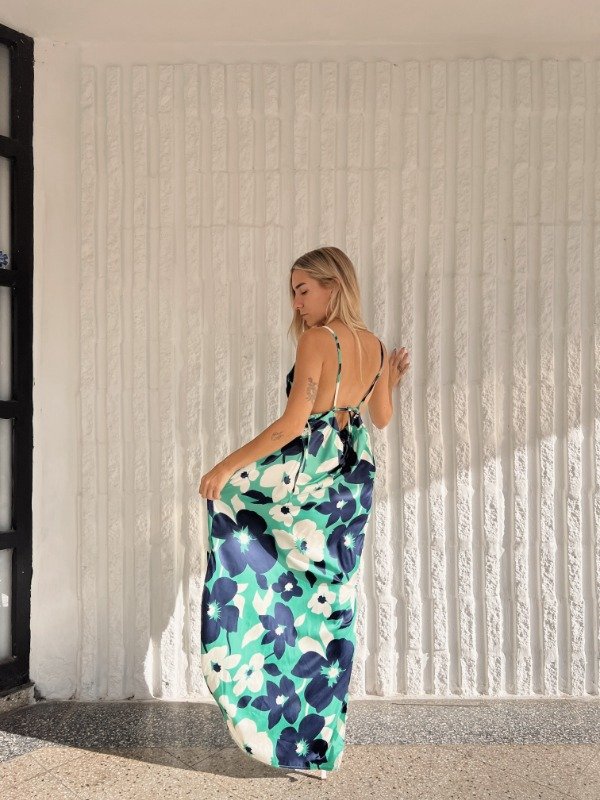 Vestido de satén estampado amplio con escote V , espalda descubierta, breteles para atar y tajos laterales.
